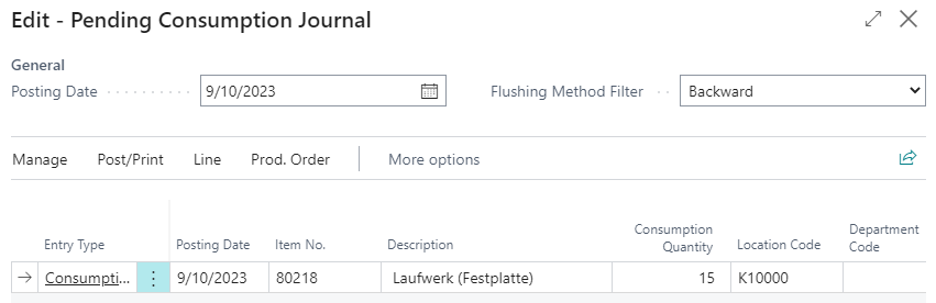 1. Open the page Pending Consumption List. You can get there through the released production order via Related, Order, Consumption Pending Entries or via the search function.