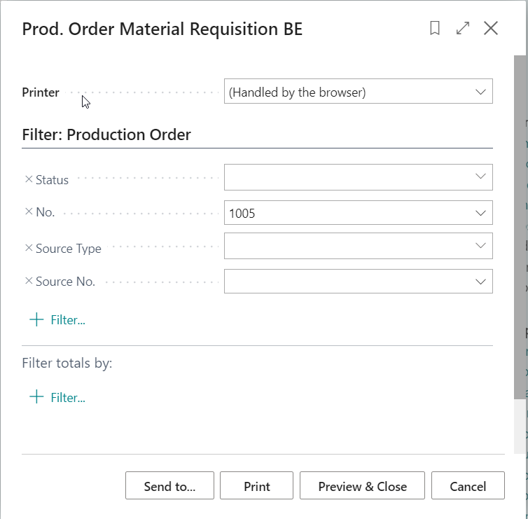 The BE-terna Manufacturing Prod Order - Material Requisition BE printout is an extension of the standard report Prod. Order - Mat. Requisition. The report extends the standard report with the columns - Routing Link Code - Expected Quantity