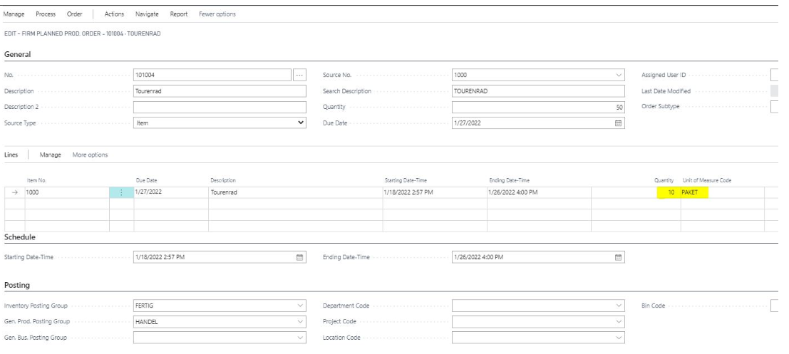 By Creating the Production Order from Sales Order the Base Unit of Measurement is used, but with this function you can use the Unit of Measurement from the Sales Line to create the Production Order. Now it is possible to handle Unit of Measurements from Sales to Production (with the following example we sell 10 PAKET (Qty. per UoM = 5) in Total 50 Pieces. The Standard would create one Production Order with 50 Pieces, our Functions allows you to create 10 PAKET (= 50 Pieces).