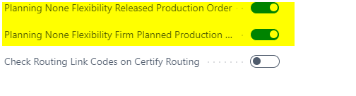 With the functions "Planning None Flexibility Released Production Order" and "Planning None Flexibility Firm Planned Production Order" in the Manufacturing Setup, if activated, it is possible to set the "Planning Flexibility" value of the production order lines to "None", when changing a planned production order to firm planned or a firm planned production order to released.