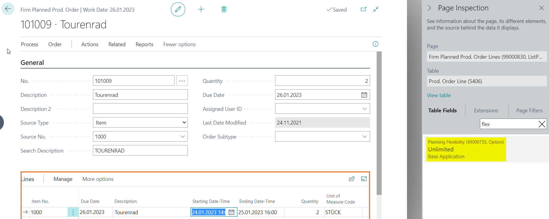 Create a new planned production order and check the set planning flexibility: