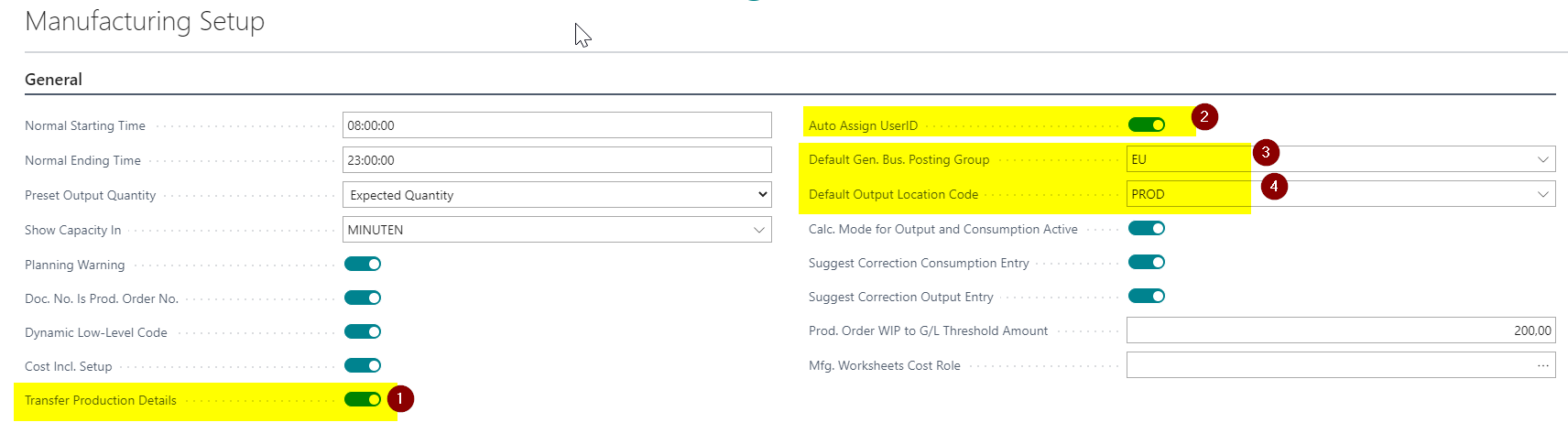 - Field Gen. Bus. Posting Group is transferred from field Def. Gen. Bus. Posting Group on Manufacturing Setup. The field is then transferred to Production Journal for posting.