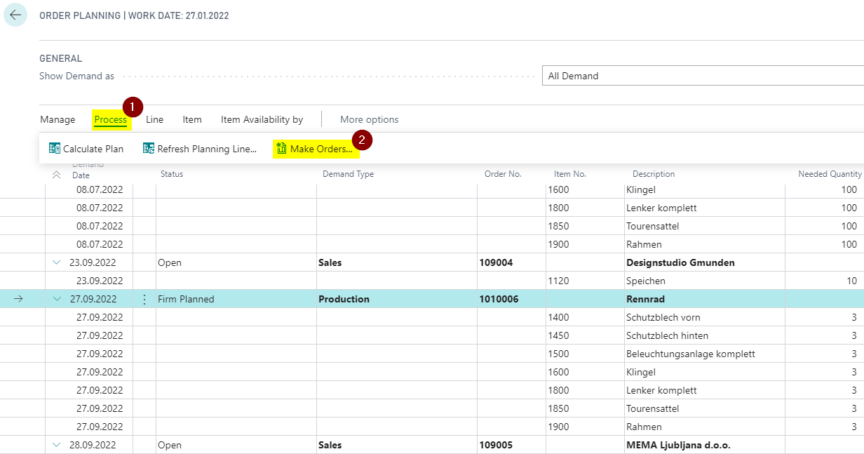 - Choose button Make Orders. Production Order is created for lines that need production order.